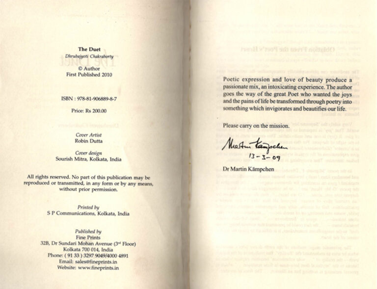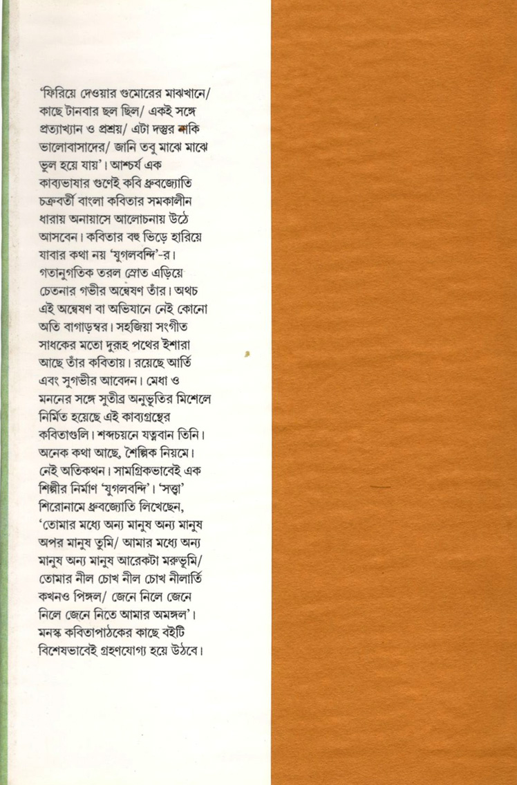 Jugalbandi means ‘two separate bodies are entwined together’. Dhrubajyoti visited different places in Europe, being invited as a Sitar artist and also as guest speaker of Ethnomusicology. His feelings and experiences about the similarities and differences of two cultures viz. European and Indian, have been expressed in the language and forms of poetry.